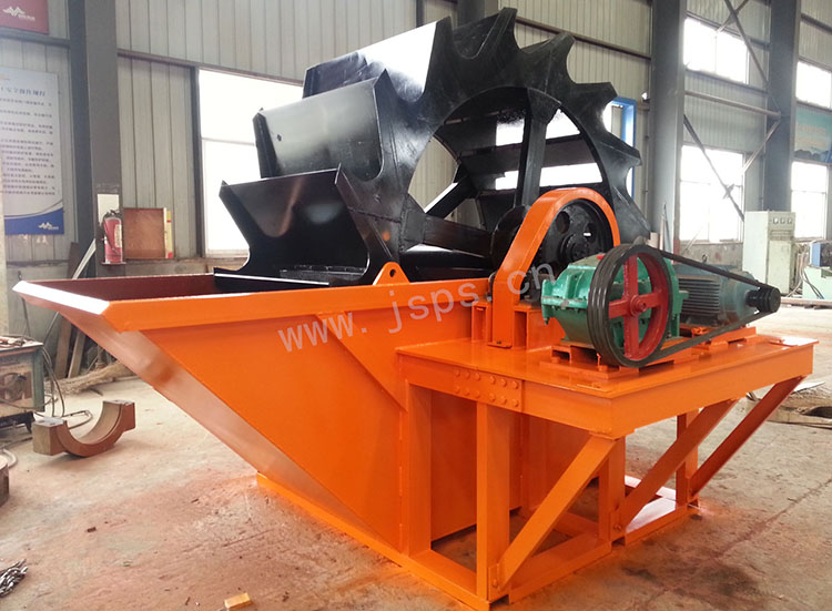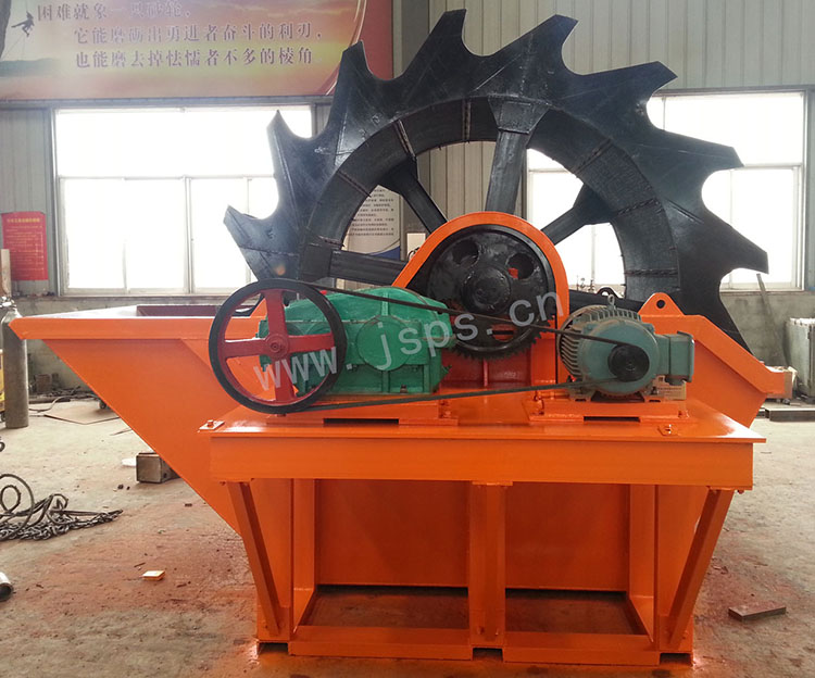 該洗砂機由傳動系統、輪斗、機架等主要部件組成,電動機通過三角皮帶經減速機,小齒輪與大齒輪嚙合,從而帶動輪斗轉動,輪斗把洗砂槽內洗凈的砂子提出,通過皮帶輸送至集料場。